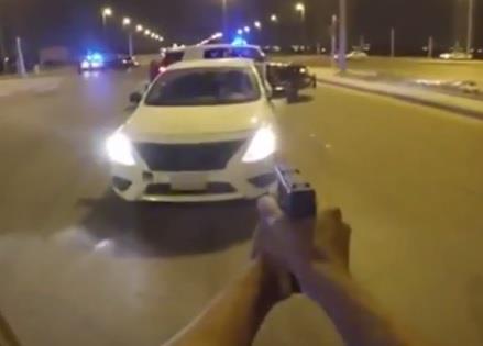 وظهرت الدورية الأمنية، التي تم تثبيت كاميرا في مقدمتها لتصوير المطاردة، وهي تلاحق السيارة المطلوبة في الشوارع المكتظة بالسيارات شمال الرياض، وتنسق مع الدوريات الأمنية الأخرى لتطويقه، وإجباره على الدخول إلى شوارع فرعية والدفع به إلى مناطق يسهل فيها السيطرة عليه.