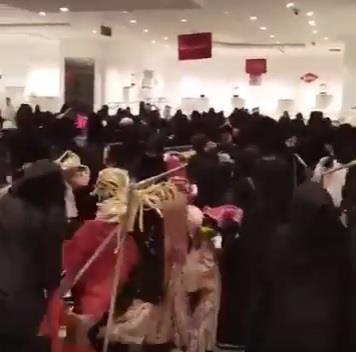وأظهر مقطع فيديو متداول زبائن المتجر، وجلهم من النساء، وهم يتدافعون على حاملات الملابس، ويخطفون القطع التي عليها تخفيضات كبيرة، في ظل فوضى عارمة، وتدافع وصراخ بأصوات مرتفعة
